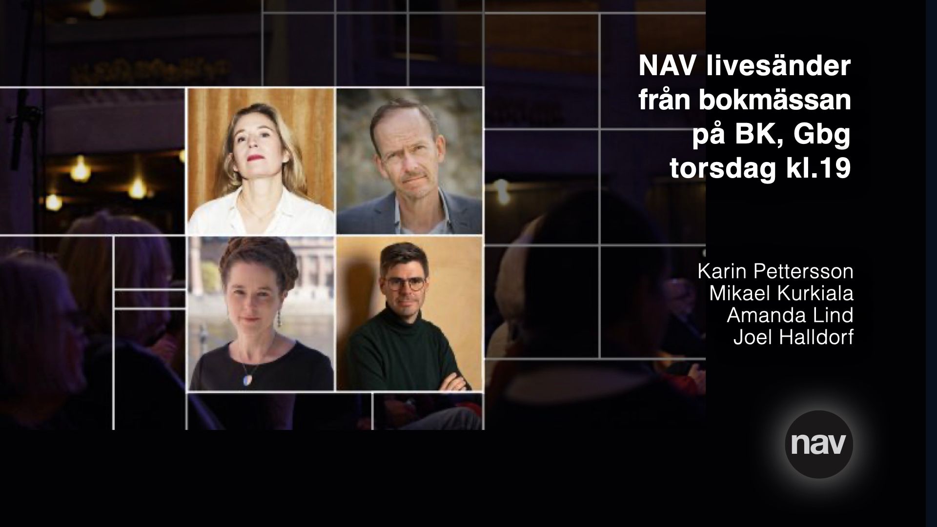 NAV har glädjen att i samarbete med BK i Göteborg bjuda in till en hub där vi sänder torsdagens event under bokmässan på BK i Göteborg. Vi ses på NAV i Nacka. Mat och dryck till bra priser. Vi tittar på livestreamen och samtalar sedan vidare tillsammans. Fri entré men obligatorisk anmälan senast kvällen innan!