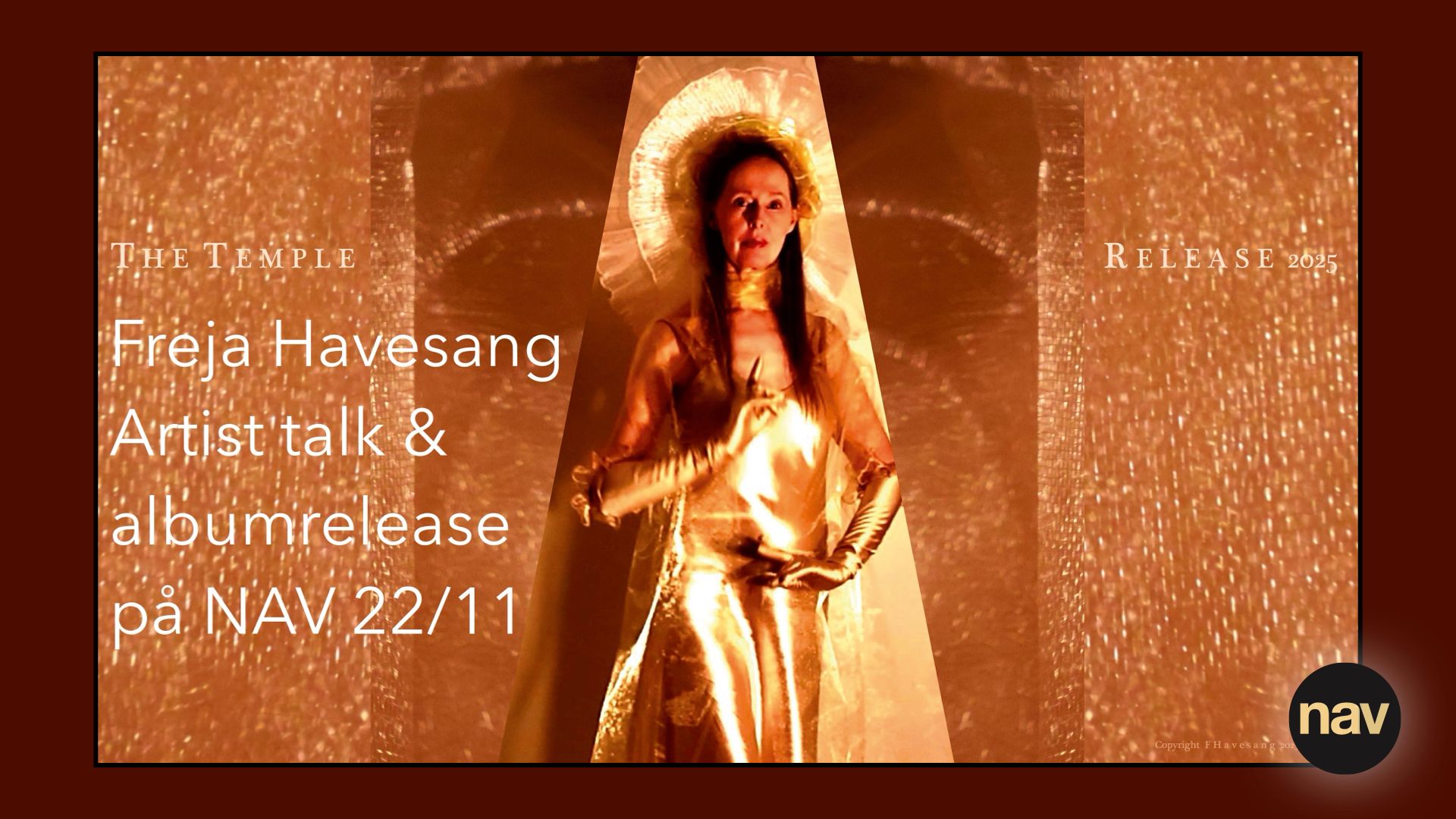 Freja kommer att presentera skivan i en artist talk, där hon berättar om processen och bakgrunden till skivan The Temple. Skivan med sin improviserade meditativa musik kommer här att spelas offentligt för första gången och musiken kommer strömma ur NAV’s fina ljudanläggning - i ett stämningsfullt rum där lyssnaren ges möjlighet att verkligen ta in musiken. Det finns plats att både sitta och ligga ner om man vill det. Även konstfilm och fysiska konstverk kommer att vara del i upplevelsen.